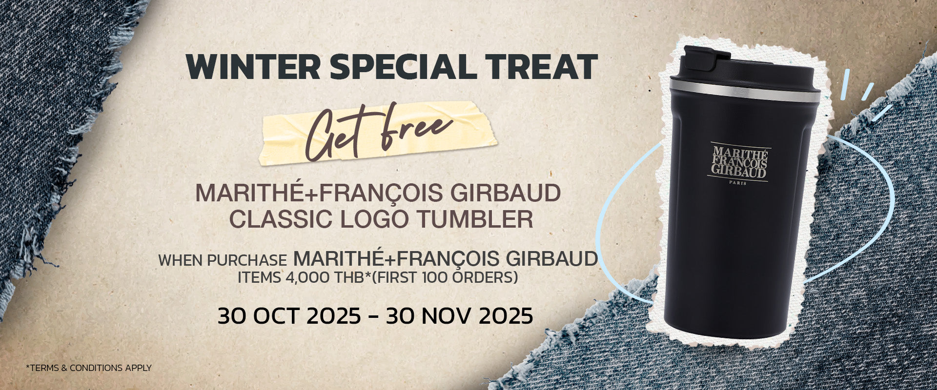 - โปรโมชั่นของขวัญ MARITHÉ+FRANҪOIS GIRBAUD CLASSIC LOGO TUMBLER เมื่อสั่งซื้อสินค้า MARITHÉ+FRANҪOIS GIRBAUD ครบขั้นต่ำ 4,000 บาท ระหว่างวันที่ 30 ต.ค. 2568 - 30 พ.ย. 2568
